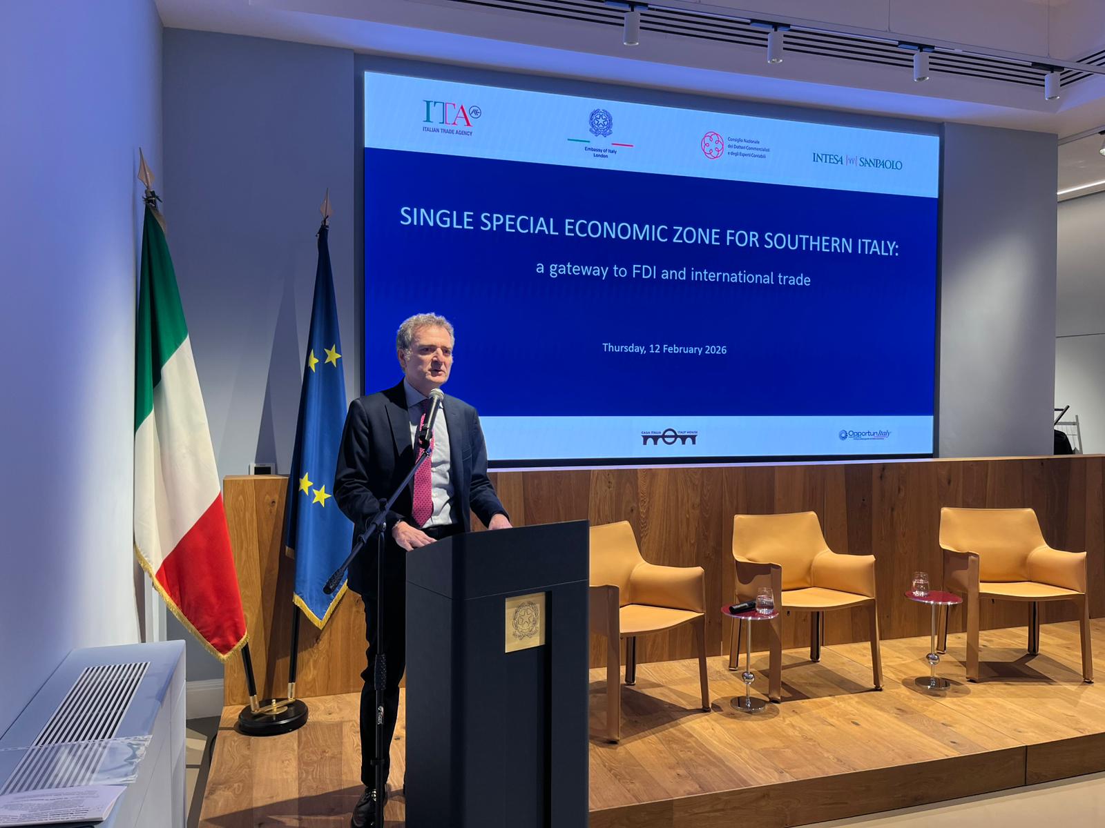An event dedicated to the Single Special Economic Zone (SEZ) of Southern Italy was held at the Embassy of Italy in London, aimed at illustrating growth opportunities in Southern Italy to British and international investors. The event, part of a wider strategy to support foreign investments in Italy highlighted how Southern Italy is a leading logistical hub in the Mediterranean, with an innovative and competitive ecosystem, supported by highly advantageous tax incentives, a highly trained workforce and administrative simplifications.